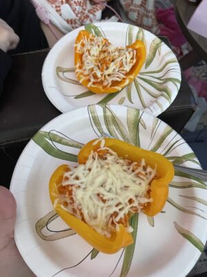 - Add two layers of ingredients to each pepper: chicken mixture, mozzarella cheese, chicken mixture, mozzarella cheese.