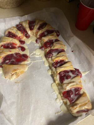 - Use a silpat or parchment paper so you can easily lift the candy cane danish from the cookie sheet. A rimless insulated baking sheet will also allow you to slide the danish off rather than trying to lift it, running the risk of breaking it.