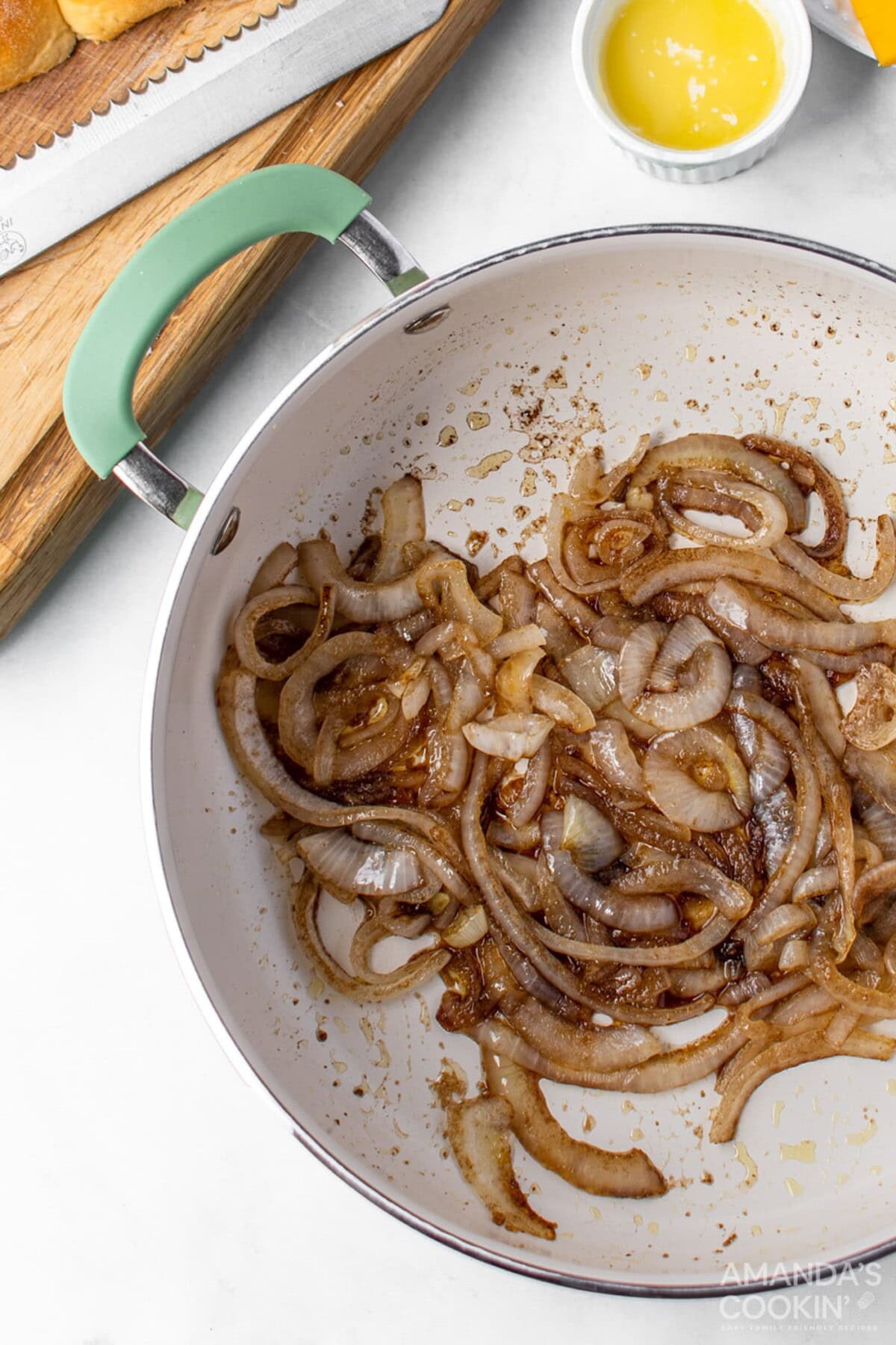 - While meat is cooking, slice the onion in half and cut into thin half onion slices. Separate slices and place them in a skillet. Pour olive oil and 2 Tablespoons of butter over onions. Cook over medium-low heat, until onions get translucent. Add the balsamic vinegar, sugar, garlic salt, and seasoning salt and cook for another 2 to 3 minutes to carmelize the onions.