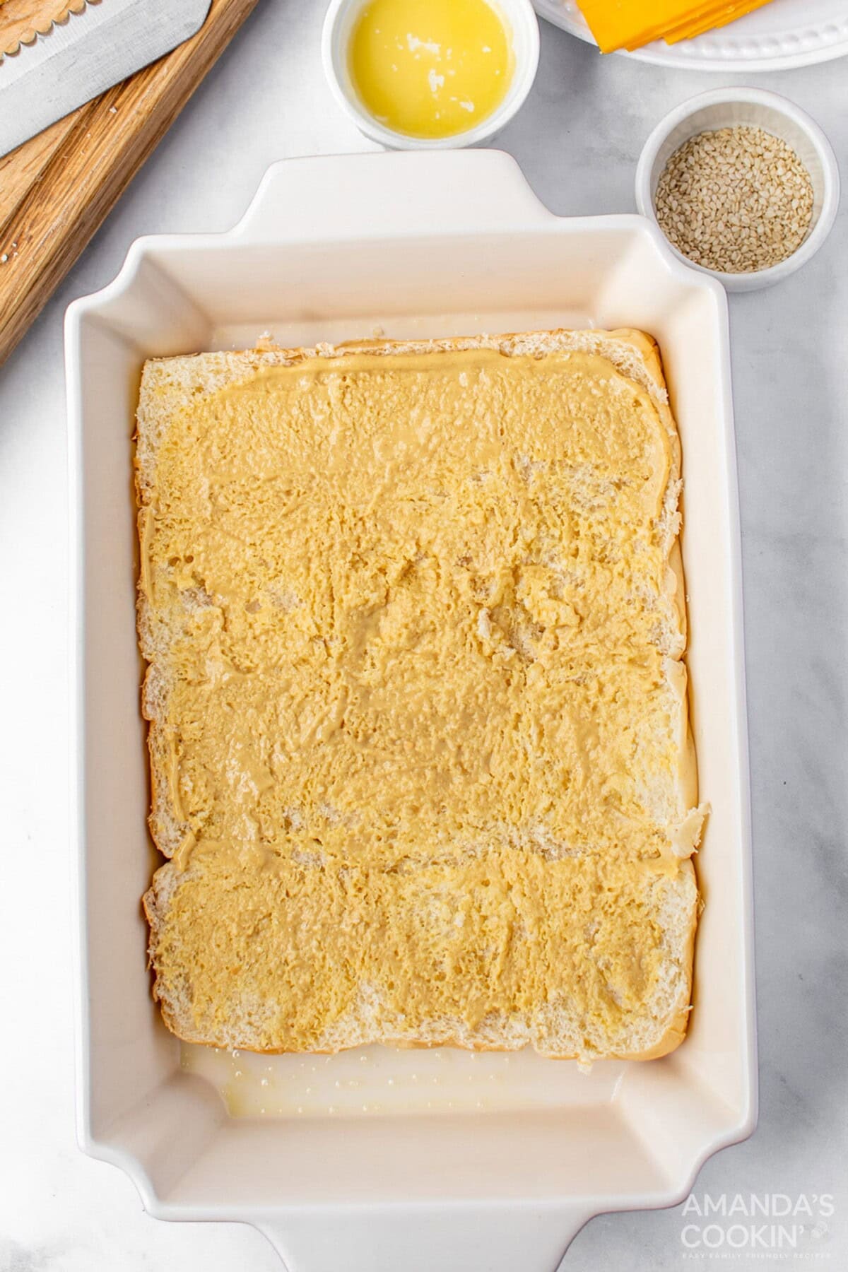 - In a small bowl, mix the dijon mustard and onion powder, then spread over the rolls in the pan.