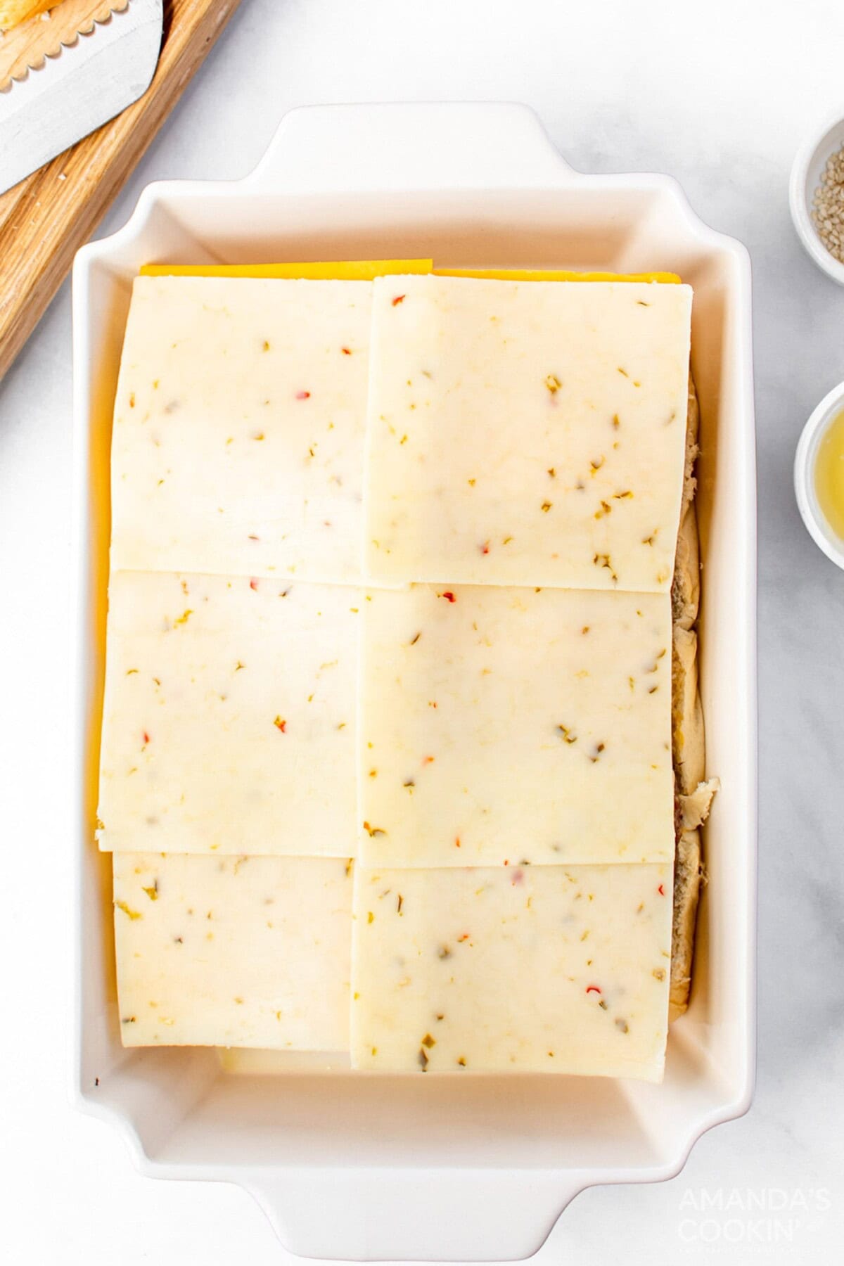 - Layer the cheddar cheese over meat in two layers. Layer the pepper jack over the cheddar.