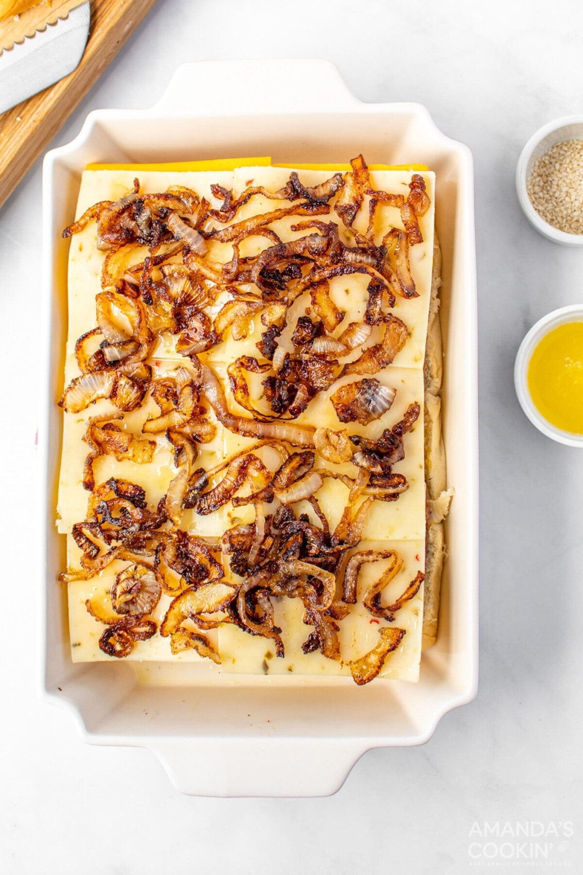 - Spread the caramelized onions over the cheese.
