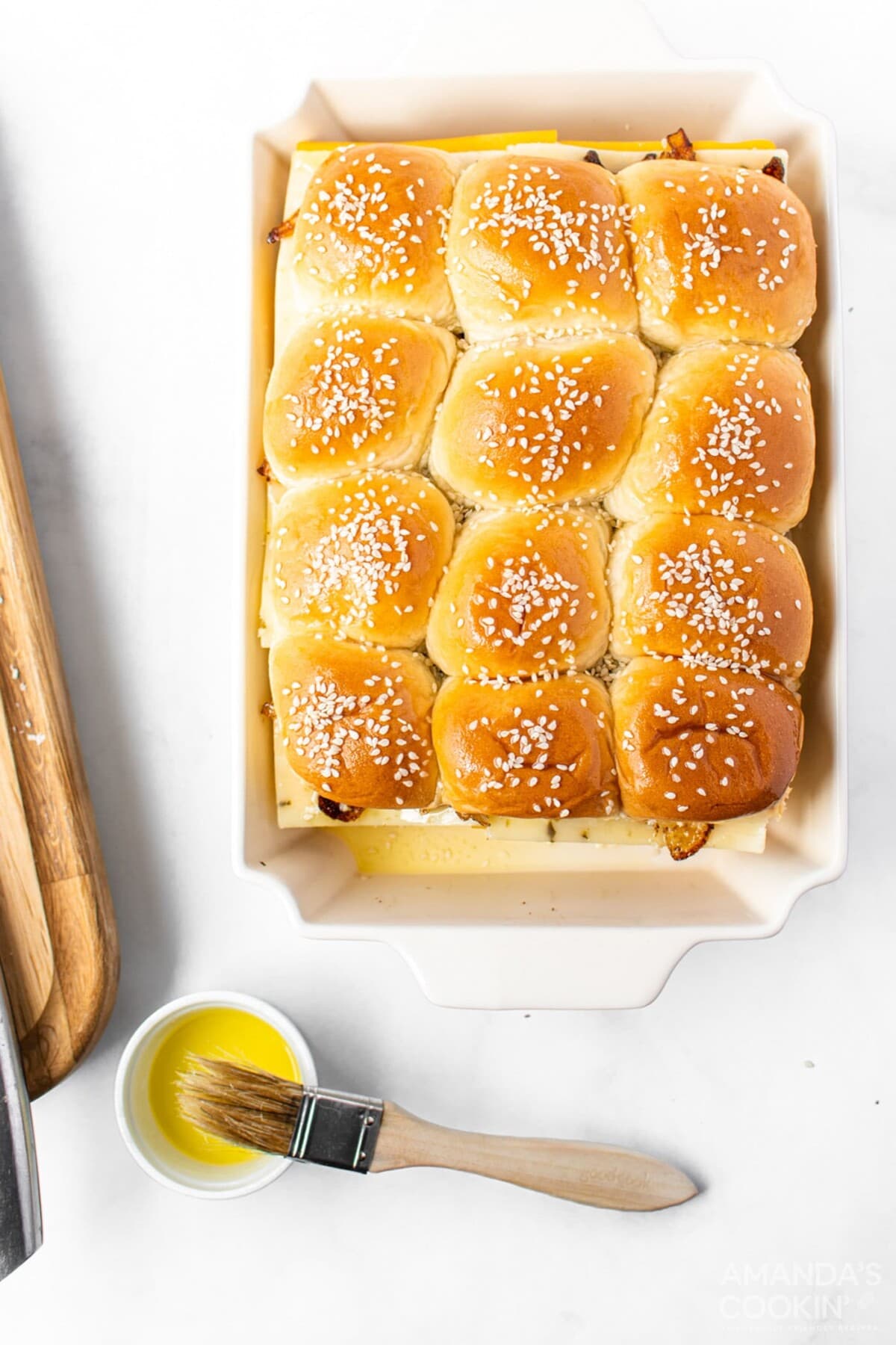 - Place the top of the rolls back on and spread remaining butter over tops. Sprinkle with sesame seeds.