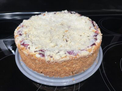 - TIP – The crust on this cake is quite thick. Press the crumb mixture down well into the pan to flatten it for a slightly less thick crust.