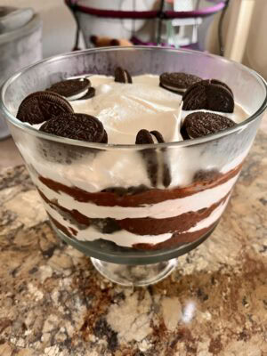 - Layer 1/3 of Oreos into a 3-quart trifle bowl. Top with 1/3 of pudding followed by 1/2 of the cream cheese mixture.