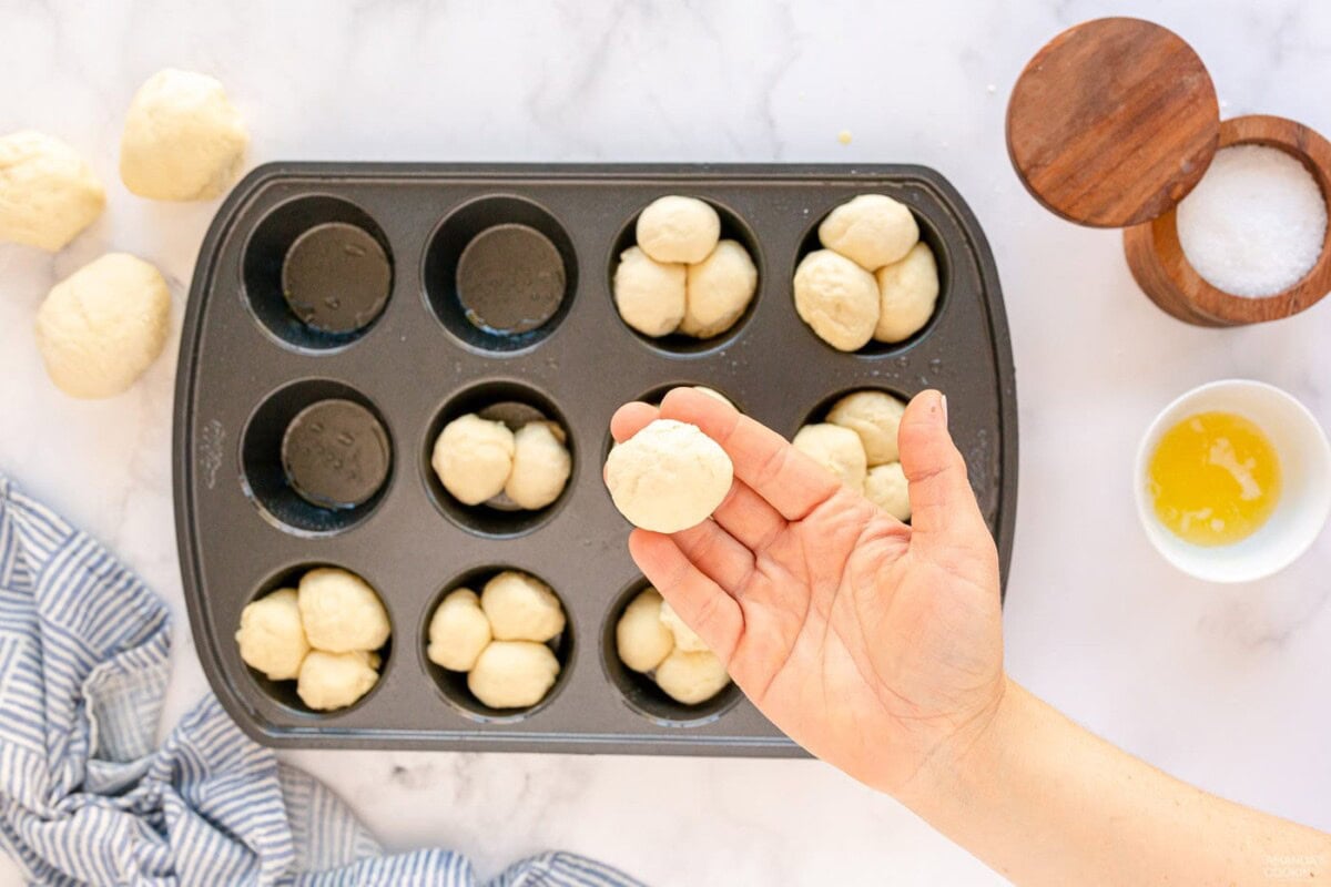 - Heat oven 400 degrees F. Punch down dough in center and fold over a few times. Prep a 12 cup muffin pan with non-stick cooking spray. Pinch off 1 inch balls of dough and quickly roll in palm of hands. Put 3 balls to one muffin cup, brush with melted butter; sprinkle with coarse salt.
