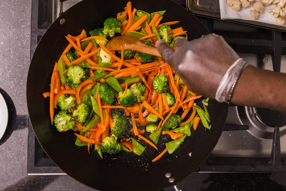 - To the remaining oil in the wok over medium-high, add broccoli, red bell pepper, carrots, and snow peas. Stir fry for 2-3 minutes.