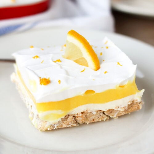 This recipe has a layer of lemon cream cheese and lemon pudding, which is similar to our lemon cheesecake pudding dessert. And who doesn’t like pudding? Pudding is comfort food for me. It’s not too sweet, so you can have a little more and really enjoy it. What’s even better? It’s a one-pan dessert which is perfect for potlucks, parties, barbecues and holidays!