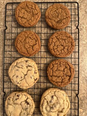 These came out really good!! I didn’t flatten mine with a glass as you suggested, but they came out fairly flat on their own. They’re nice and chewy and really well spiced. I was super hesitant about adding pepper to cookie dough, but I think it really helps the flavor of the other spices shine! It leaves an almost spicy aftertaste in the best way possible. My cookies were good at 12 ish minutes (oops I forgot to start the timer at first). Again, great recipe. That soft, chewy center is killer. The picture below is with your chocolate chip cookie recipe (my FAVORITE). I froze the rest of the dough balls to pull out closer to Christmas!