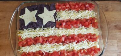 TOPPING – The flag design on top is made from chopped tomatoes, shredded mozzarella cheese, and crushed blue tortilla chips. For the star cutouts, you can use pre-sliced cheese or cut slices from a block of cheese. Use any size star-shaped cookie cutter that you’d like. Alter the number of stars based on the size of the cookie cutter to fill in the area over the corn chips. You could also use diced red pepper or halved cherry tomatoes in place of the chopped tomatoes for the stripes.